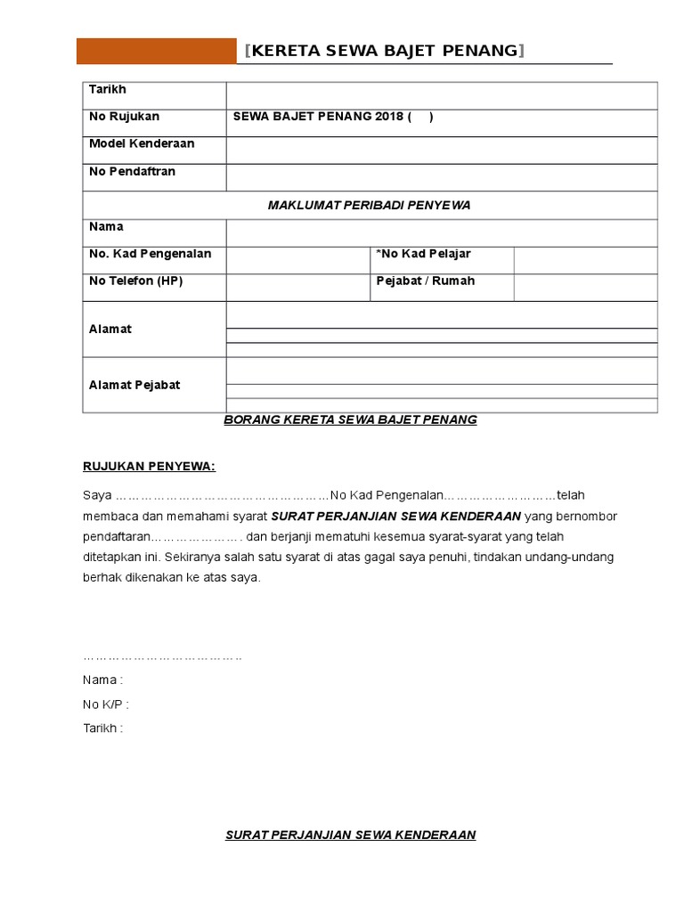 . Borang Permohonan Sewa Tempat Letak Kereta Bermusim Harian Akta Pengangkutan Jalan 1987 1 files 270 downloads. Tidak perlu cari tempat lain lagi. Untuk muat turun contoh surat perjanjian sewa kereta sila klik link di bawah.
